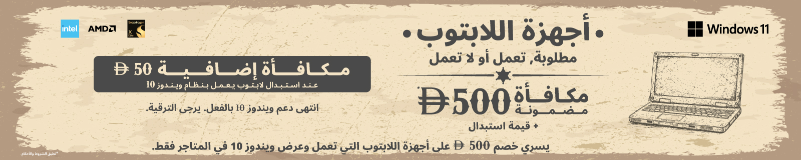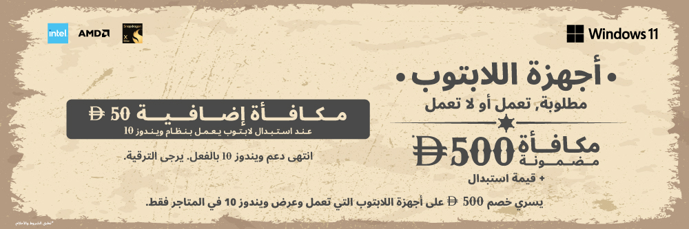 • استبدل أي لابتوب يعمل واحصل على خصم مضمون بقيمة 500 درهم إماراتي على لابتوب ويندوز جديد (يسري في المتاجر فقط).